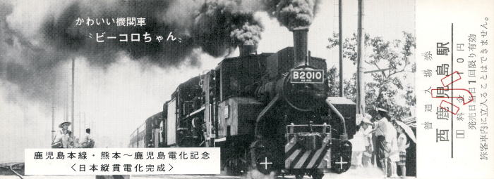 1970年/昭和45年9月30日,鹿児島本線 熊本-鹿児島電化による蒸気機関車の廃止を記念して, 西鹿児島駅発行の4枚組記念入場券です。 C57,C60,D51,B20の写真が描かれています。 1969年当時,鹿児島機関区に B20,8620,C12,C56,C57,C60,C61,出水機関区(鹿児島本線)にD51が配置, 鹿児島本線ほかに運用されていました。 1968年9月30日に熊本-川尻,1970年9月1日に川尻-鹿児島が電化され,鹿児島本線全線が電化されました。 このとき,出水機関区の機関車の配置がなくなり,翌年1971年に廃止になりました。 1970年9月30日にC6133牽引さよなら列車が運転され,鹿児島本線の蒸気機関車運用が廃止になりました。 |