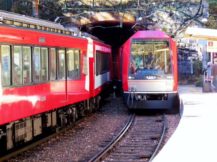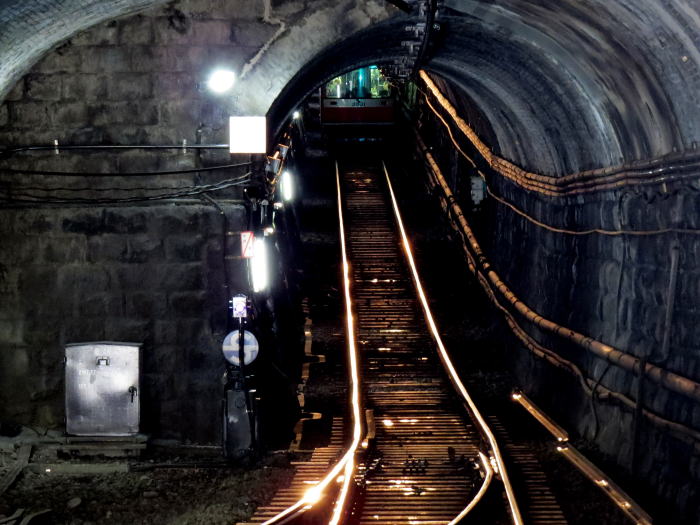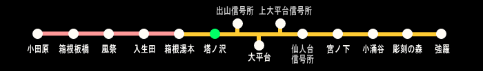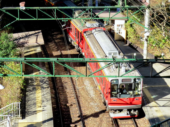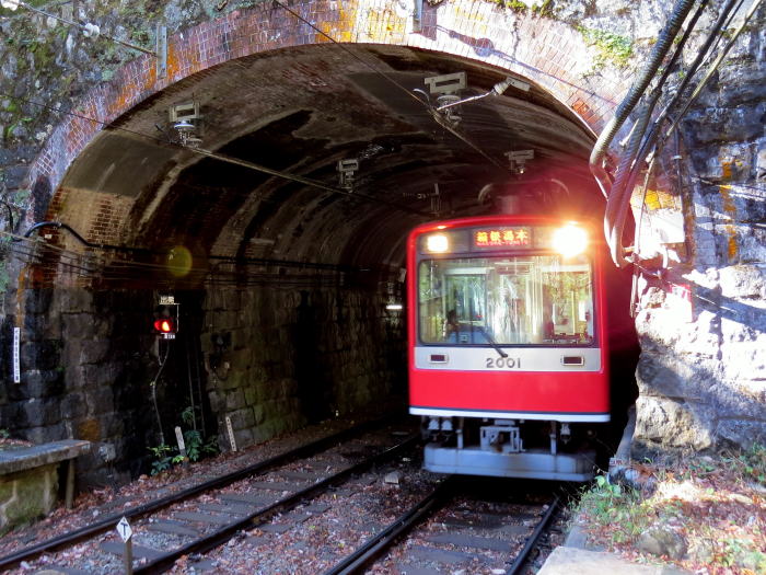 塔ノ沢駅は,トンネルに挟まれた山間の駅です。 強羅方向のトンネル内は80‰の勾配で,トンネルを降りてくる電車を撮影できます。 また,トンネル上の登山道から塔ノ沢駅に発着する電車を俯瞰できました。 塔ノ沢から箱根湯本は直ぐ,3分の所要です。 |