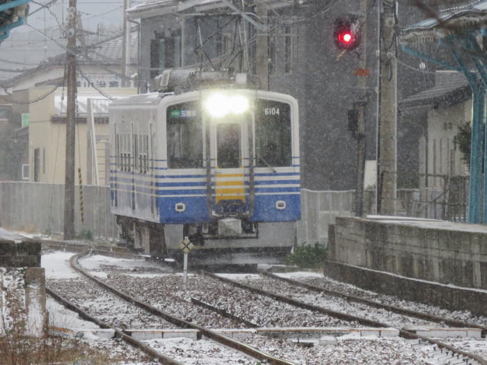 福井行電車を待つ間,吹雪の中をあわら湯のまち駅に到着する三国港行電車を撮影しました。