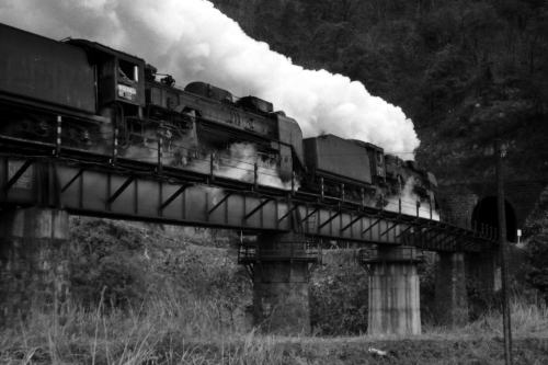 1971年/昭和42年当時,伯備線の足立-新見間に, D51×3輌が牽引する石灰石列車(4292レ)が運転されていました。 全国の鉄道ファンが,D51三重連を撮影するため布原に集まりました。 第23西川橋梁を渡る3重連を撮影する絶好のポイントである 苦の坂トンネル脇の山肌に, 大勢の鉄道ファンが三脚を立てて3重連の通過を待ちました。 山岳路線の伯備線では, 多くの貨物列車がD51重連(D51+D51)で運用されていました。 4292レは重連に回送D51が連結され,D51三重連になっていました。 4292レは東海道山陽新幹線・岡山開業(1972/3/15)まで走りました。 |