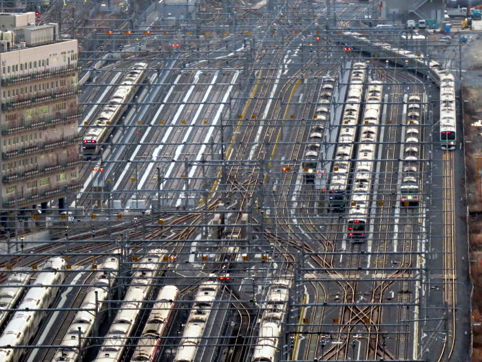 東京機関区の跡地に新設された大規模な留置線に,東海道線,常磐線の電車が留置されています。