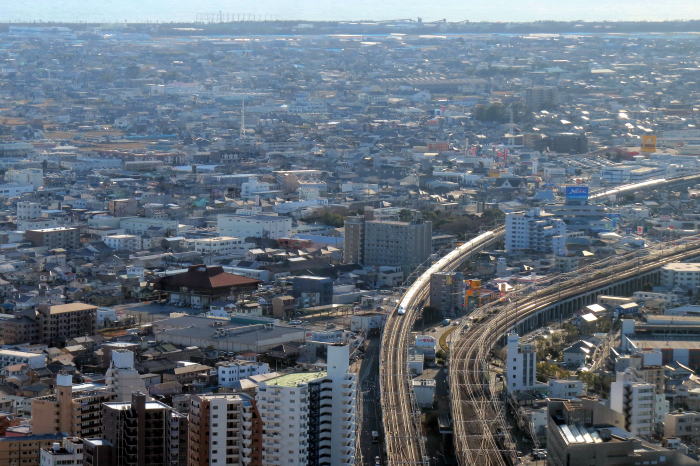 | 浜松 上空 ◆浜松駅に隣接する浜松アクトタワーは, 浜松のランドマークになる地上45階の超高層ビルです。 1994年/平成6年に開業しました。 音楽の町浜松をイメージするハーモニカをモチーフにして このビルは,デザインされています。 最上階(地上185m)に展望台があります。 展望台からは,南方向,真下にJR浜松駅が望め, 東海道新幹線,東海道本線の列車を撮影できます。 北方向に遠州鉄道・西鹿島線の高架線を俯瞰できます。 遠州鉄道はJR浜松駅の西にある新浜松駅と 天竜浜名湖鉄道に接続する西鹿島駅を結びます。 |