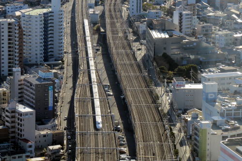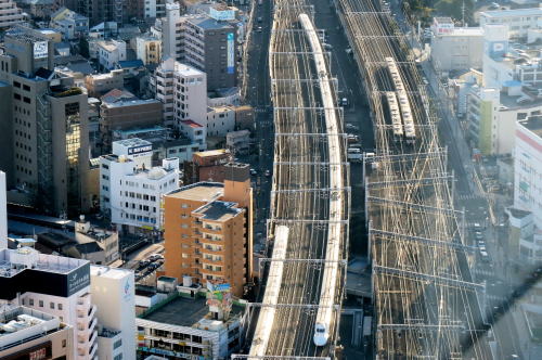 | 浜松西空散歩 ◆浜松アクトタワー展望フロアから 豊橋方向の東海道新幹線と東海道本線を 走る列車を撮影しました。 展望フロアの南側西方向には,遠くに遠州灘, 浜松駅構内から豊橋方向に続く線路が見えます。 豊橋方向に夕陽に輝くのぞみが現れ,ぐんぐんと近づき, 停車中のこだまをあっという間に走り抜けました。 |