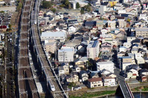 | 浜松 東空・北空散歩 ◆浜松アクトタワー展望フロアから 静岡方向の東海道新幹線と遠州鉄道・西鹿島線を 走る列車を撮影しました。 東海道新幹線は,東方向に東海道本線と並行して走り 新幹線は海側,東海道本線は山側に分かれます。 展望フロアの北方向に, 遠州鉄道の高架線(第一通り-上島)が望めます。 2輌編成の赤塗色の電車が高架線を走ります。 |
