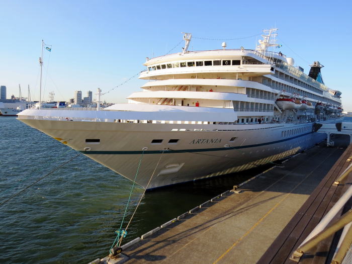 44656G.T./213m/29m/1984年就航 船籍港 HAMILTON〔バミューダ〕 Phoenix Reisen ドイツのフェニックス・ライゼン運航の“アルタニア”が,横浜に初来航しました。 “アルタニア”は1984年にプリンセス・クルーズの“ロイヤル・プリンセス”として就航しましたが, 2005年にP&Oクルーズが購入して“アルテミス”に改名, 2011年にArtania Shippingに売却され“アルタニア”に改名されフェニックス・ライゼンが運航しています。 今回は,ワールドクルーズの途上で寄港,ウラジオストックに向け出港しました。 |