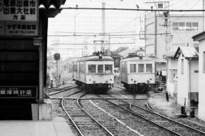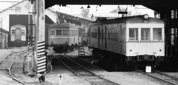 | デハ1形・3号と70系・デハ70形・71号 1974 平田市〔一畑電気鉄道 北松江線〕 | ||