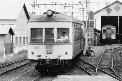 平田市駅(現・雲州平田駅)には,当時から一畑電鉄(現・一畑電車)の本社と車庫があります。 ホームに隣接した車庫には,デハ1形,デハ20形,デハニ50形,60系,70系などや, 留置の凸型電気機関車ED22,貨車を撮影することができました。 デハ1形,デハ20形,デハニ50形などはオレンジ色車体に白線の塗色で普通列車に, 西武鉄道から譲渡・改造された60系,70系などは,クリーム色車体に青線の塗色で, 急行列車に運用されていました。 |