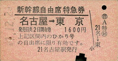 新幹線自由席特急券 名古屋 → 東京 発売日共2日間有効 ひかり号自由席に限り有効 1600円 昭和49年12月24日 名古屋駅発行 |