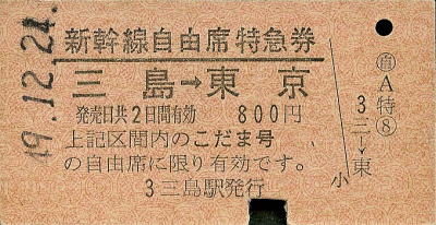 新幹線自由席特急券 三島 → 東京 発売日共2日間有効 こだま号自由席に限り有効 800円 昭和49年12月24日 三島駅発行 |