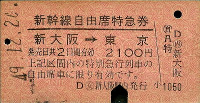 新幹線自由席特急券 新大阪 → 東京 発売日共2日間有効 特別急行列車の自由席に限り有効 2100円 昭和49年12月24日 (交)新大阪駅内発行 |