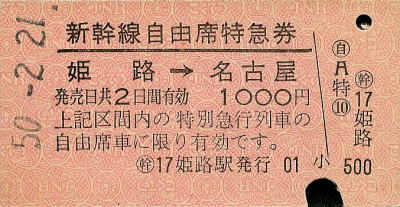 新幹線自由席特急券 姫路 → 名古屋 発売日共2日間有効 特別急行列車の自由席に限り有効 1000円 昭和50年2月21日 姫路駅発行 |