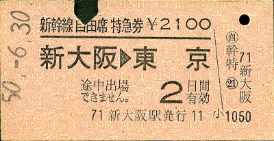 新幹線自由席特急券 名古屋 → 東京 発売日共2日間有効 2100円 昭和50年6月30日 新大阪駅発行 |
