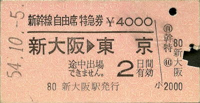 新幹線自由席特急券 新大阪 → 東京 発売日共2日間有効 4000円 昭和54年10月5日 新大阪駅発行 |