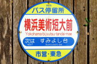 ●バス停標識 ![]() 路線バスのバス停の多くは, コンクリートの土台に 円形標識を付けたバスポールです。 標識のサイズ・デザインは多彩。 |