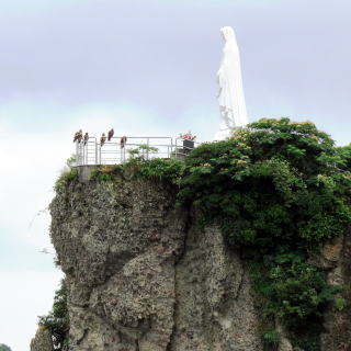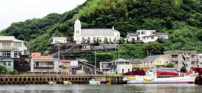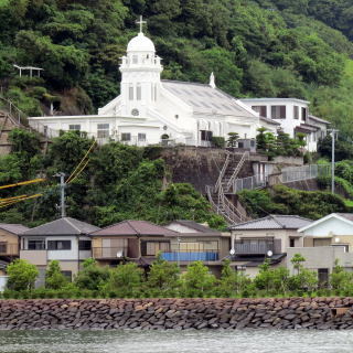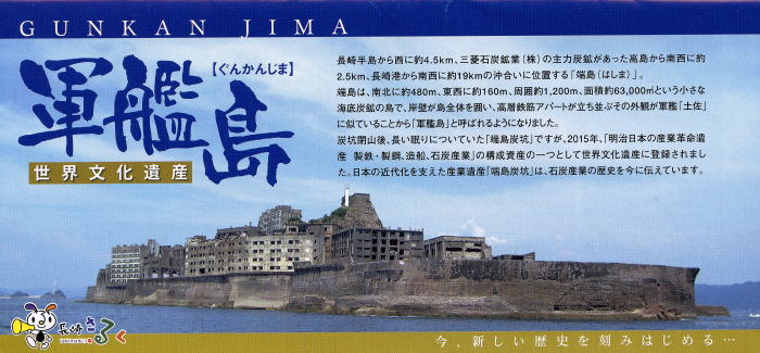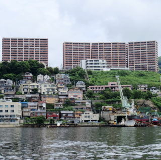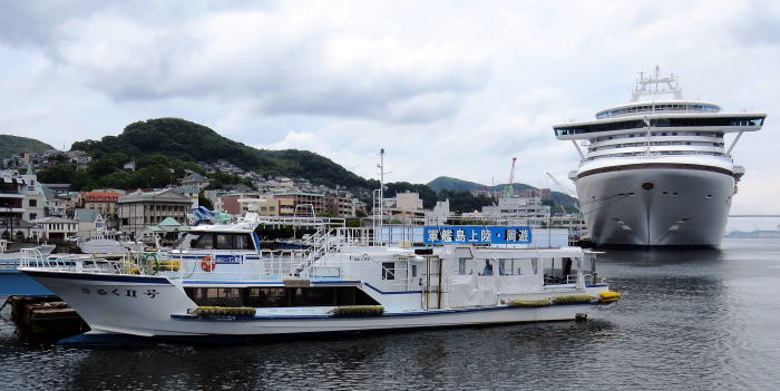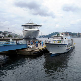 | 大浦海岸通の常盤2号桟橋から軍艦島ツアーの観光船が出港します。 観光船は,三菱重工長崎造船所立神工場,元外国人居留地の大浦バンドを通過して 女神大橋をくぐり,神の島教会・マリア像を眺め軍艦島に向かいます。 軍艦島を1周して上陸,3ヶ所の見学広場から建物群を見物します。 約2時間30分のコースです。 |