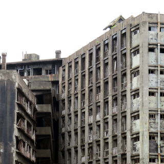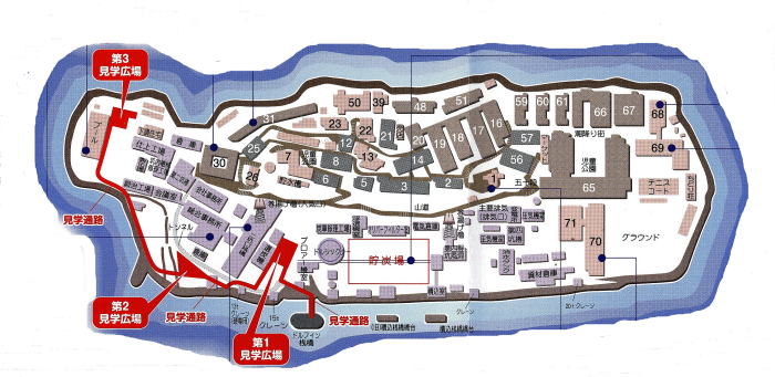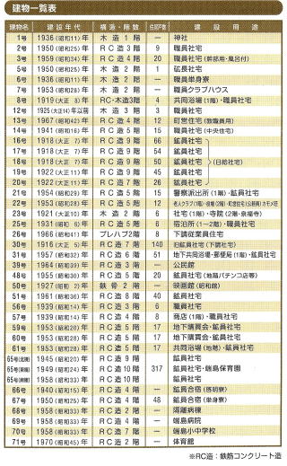 閉山時の建物の約半数が,現在も残っています。 上図の建物番号と右表の建設年,構造・階数などから 当時の繁栄振りを偲ぶことができます。 ●30号・31号/高層アパート 1916年/大正5年に建てられた30号アパートは, 日本最古の7階建鉄筋コンクリート造高層アパート。 鉱員アパートとして建設され, 内庭には吹き抜けの廊下と階段があり 地下には,売店もありました。 31号アパートには,地階に一般用の共同浴場があり, 1階には,郵便局や理髪店も設置されていました。 ●70号/端島小中学校 1958年/昭和33年建設の鉄筋コンクリート造7階建。 1階から4階までが小学校,5階と7階が中学校, 6階に講堂,図書館,音楽室がありました。 1970年/昭和45年には,体育館や給食設備が新設, 給食を運ぶ島で唯一のエレベータがありました。 ●第二竪坑坑口桟橋 主力坑だった第二竪坑を含め, 鉱山施設は,現在,ほとんどが崩壊していますが, 第二竪坑へ行くために設けられた桟橋への 昇降階段部分が残っています。 ●総合事務所 鉱山の中枢であったレンガ造の建物です。 総合事務所の中には, 炭鉱マンのための大きな共同浴場がありました。 この周辺には,多くの建物がありましたが, 現在では,ほとんどが崩壊しています。 |