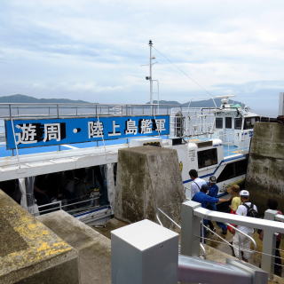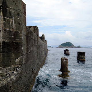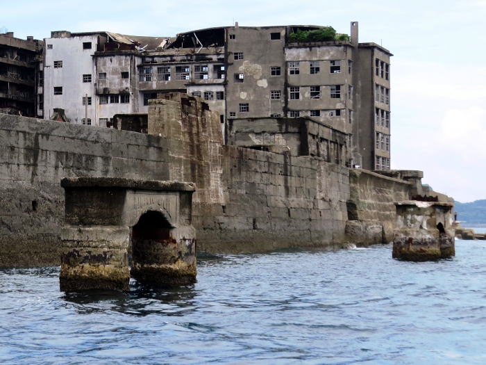 | 岸壁に設けられたドルフィン桟橋から乗下船 | 軍艦島の護岸 |