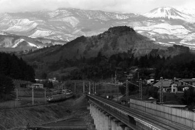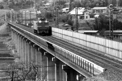 東北本線・松川-金谷川-南福島は上下線が単独に走ります。 東北新幹線開業前,この区間を走る昼行特急は, 秋田特急“つばさ”,山形特急“やまばと”, 仙台特急“ひばり”,盛岡特急“やまびこ”,青森特急“はつかり”であり, 485系,583系が運用されていました。 松川-金谷川のコンクリート橋では, 頻繁にやってくる上りの特急電車,客車列車,貨物列車を俯瞰撮影できました。 当時,ED75が客車列車,貨物列車の牽引に大活躍でした。 |