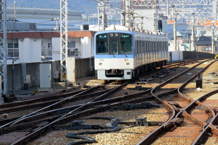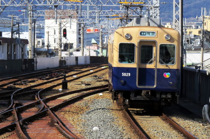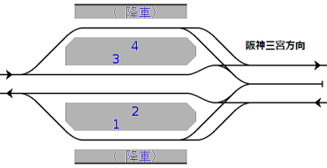 上下線の間にある引上げ線は,梅田方向からの列車の折返し運転に使用されます。
