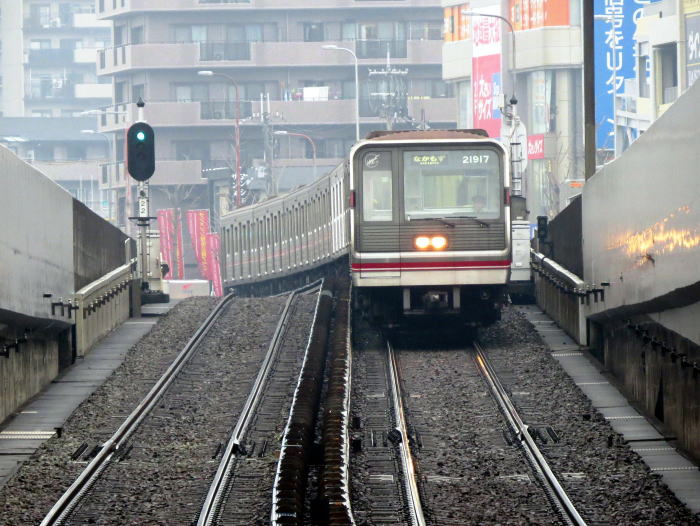 地下鉄線特有の架線のないすっきりした線路を大阪市交通局21系電車が下ってきました。