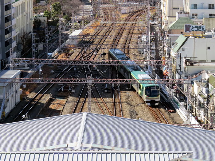 “かまたえん”は,都内唯一の屋上観覧車(幸せの観覧車)のある遊園空間です。 この日は寒く人はほとんどおらず,観覧車も開店休業状態でした。 “かまたえん”の南壁(木製柵)からは, 蒲田駅を発着する池上線,多摩川線の電車を踏切の先まで俯瞰撮影できます。 ただし,撮影位置が低い(3階屋上)ため,架線柱と電車の重なりが多くなります。 |