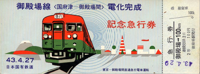 | ◆御殿場線(国府津-御殿場間)電化完成記念急行券 1968年/昭和43年4月29日発行 | ||