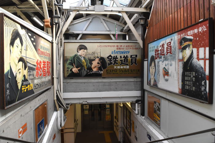 | 駅舎とホームを結ぶ地下通路・昭和レトロの映画ポスター | ||