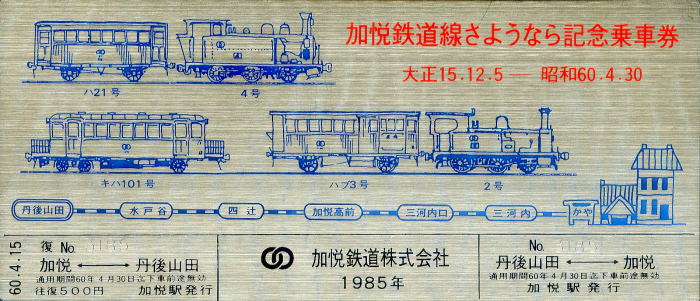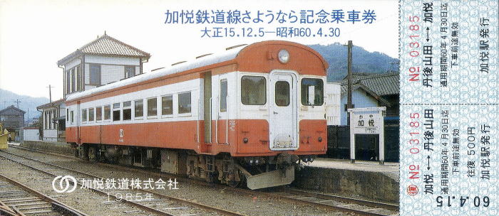| ◆加悦鉄道 加悦鉄道線さようなら記念乗車券 1985年/昭和60年4月15日発行 | ||
