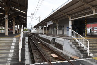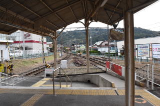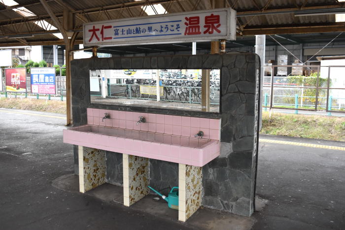 大仁駅は大仁温泉の玄関駅であり, 大仁駅に隣接して東芝グループの東芝テック事業所があります。 特急“踊り子号”の停車駅です。 大きくカーブした島式ホーム1面2線の地上駅であり 列車交換のない場合は,上り/下り列車は2番線に発着, 列車交換する場合のみ,上り列車は2番線・下り列車は1番線に発着します。 1番線使用時は構内踏切が閉じます。 ホームには洗面台があります。 大仁駅は1899年/明治32年に伊豆長岡-大仁間開通,終着駅として開業, 1924年/大正13年の大仁-修善寺間の開業により中間駅になりました。 1番線の駅舎側ホームは終着駅当時に使用されましたが, 現在は不使用になっています。 |