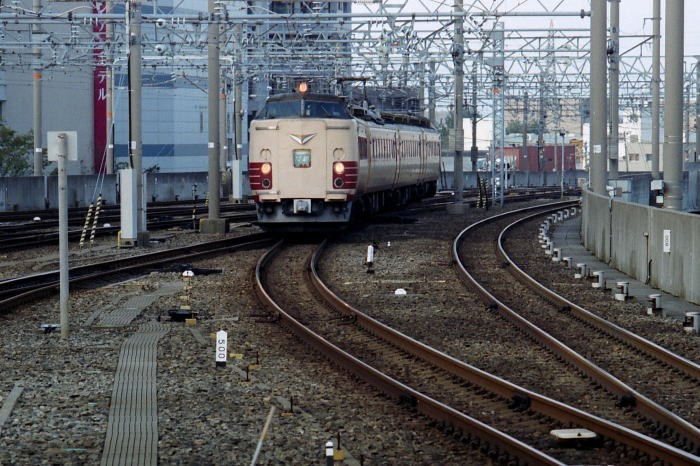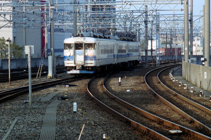 1999年/平成11年9月26日,出張の途中に金沢駅を発着する列車を撮影しました。 当時の金沢駅には,大阪・名古屋・米原・新潟・越後湯沢を結ぶ 485系,681系特急が頻繁に発着していました。 大阪へは485系“雷鳥” 11往復,485系“スーパー雷鳥” 4往復, 681系“サンダーバード” 8往復が運転され, 名古屋とは485系“しらさぎ”,米原とは485系“加越”,新潟とは485系“北越”, 上越新幹線に接続する越後湯沢とは485系・681系“はくたか”が結びました。 これらの特急の合間に,419系・475系普通“TOWNトレイン”が運転されていました。 |