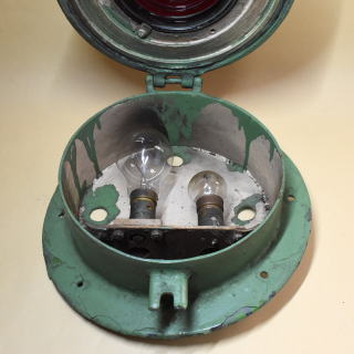 江ノ島電鉄 300形の電燈式尾灯です。 直径275mm・鋳鉄製・電球は110V 60Wと110V 10Wの2球 300形は1956-68年/昭和31-43年に 自社・都電・西武・京王の電車を種車に2輌連接構造に改造した電車です。 2編成×6本 (301-306)・12輌が導入されました。 種車と改造手法がまちまちであったことから 302・303編成を除く4編成は形態・仕様が異なっていました。 300形は繰り返し改造を受け 前照灯を腰部2灯化したとき,尾灯も更新されました。 1976年/昭和51年に江ノ島駅で この尾灯と同型の尾灯を付けた302編成を撮影しています。 302編成は1998年に引退,山梨のキャンプ場バンガローに利用されました。 現在2026年,冷房装置搭載など近代化改造が実施された305編成のみが 最古参の電車として活躍しています。 |