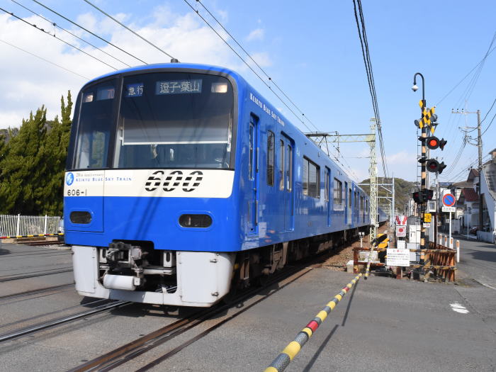 京浜急行電鉄 逗子線 神武寺近くの踏切で,KEIKYU BLUE SKY TRAIN を撮影しました。